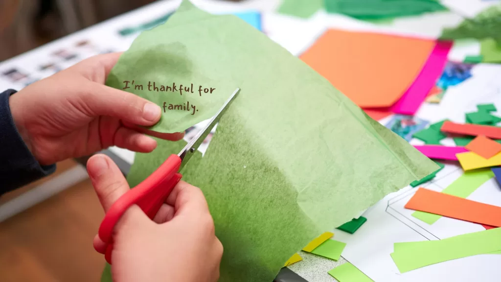 Using paper in warm fall colors—reds, oranges, yellows, browns—cut out leaf shapes of any size. On each leaf, write something you’re thankful for. Encourage kids to think about: